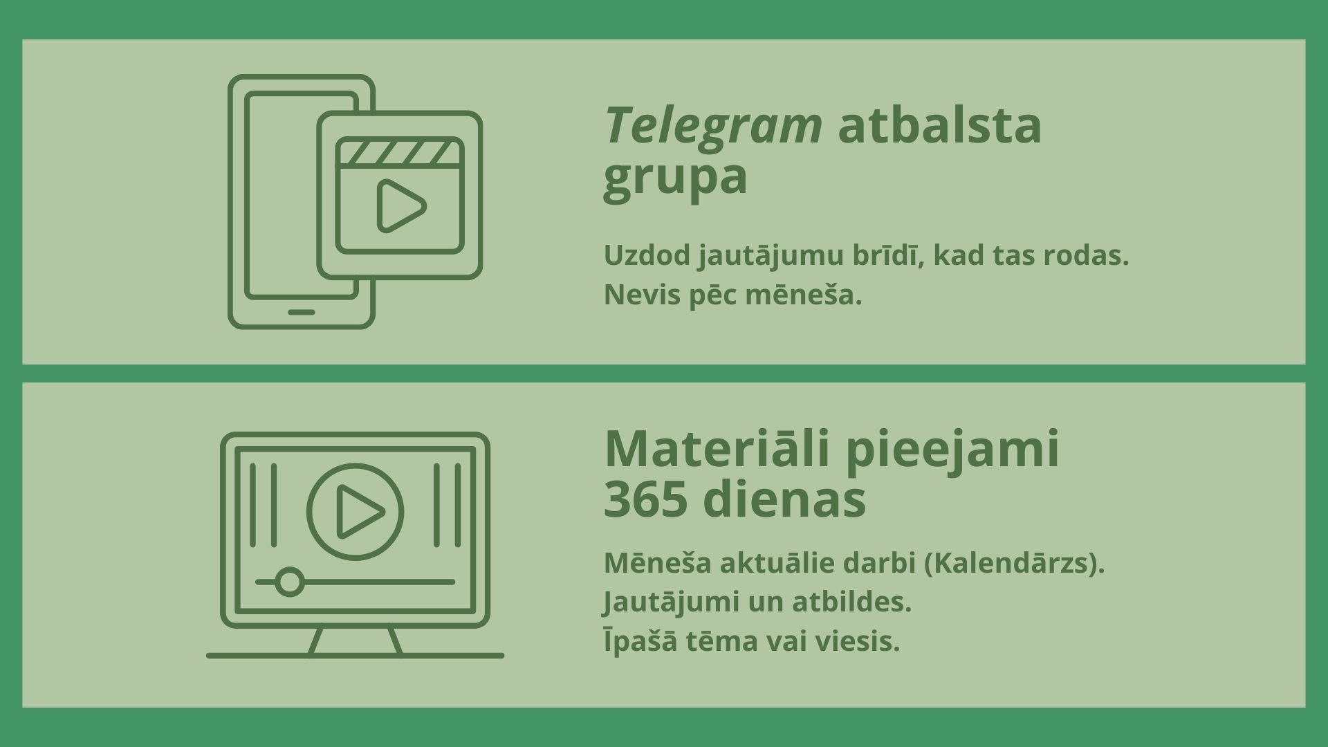grupaKursa laikā un vēl mēnesi pēc tam vari saņemt atbalstu Telegram grupā. Uzdod jautājumus, dalies ar fotogrāfijām un situācijām, kā arī saņem praktiskas rekomendācijas.